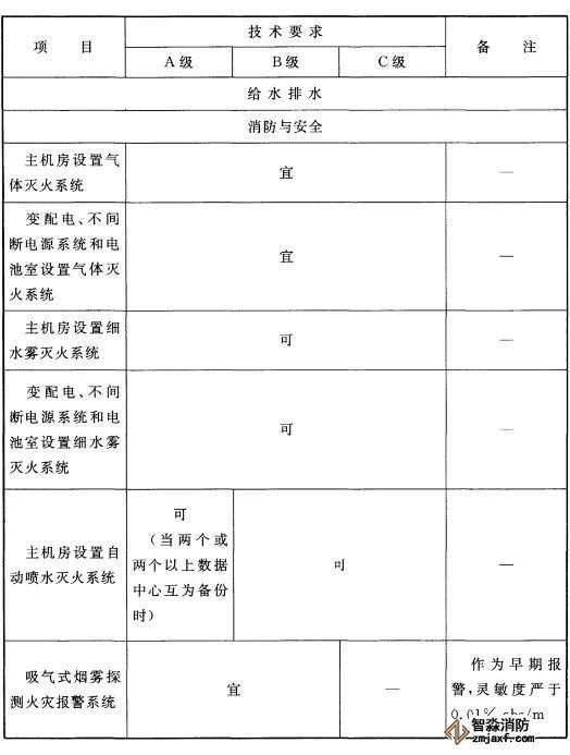 3、B級(jí)數(shù)據(jù)中心和C級(jí)數(shù)據(jù)中心的主機(jī)房宜設(shè)置氣體滅火系統(tǒng),也可設(shè)置細(xì)水霧滅火系統(tǒng)或自動(dòng)噴水滅火系統(tǒng)。