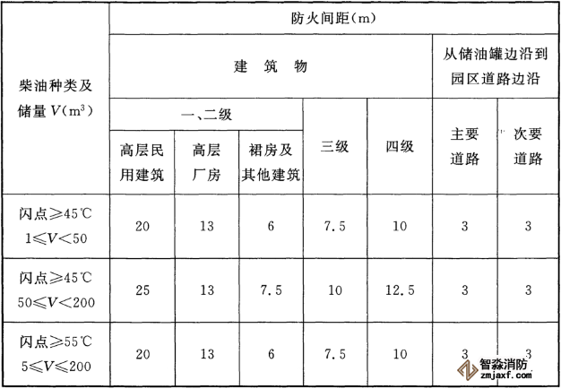 7、當(dāng)單罐柴油容量不大于50m³,總柴油儲(chǔ)量不大于200m³時(shí),直埋地下的臥式柴油儲(chǔ)罐與建筑物和園區(qū)道路之間的最小防火間距除應(yīng)符合下表5的規(guī)定外,并應(yīng)符合現(xiàn)行國(guó)家標(biāo)準(zhǔn)《建筑設(shè)計(jì)防火規(guī)范》GB 50016、《汽車(chē)加油加氣站設(shè)計(jì)與施工規(guī)范》GB 50156和《石油化工企業(yè)設(shè)計(jì)防火規(guī)范》GB 50160的有關(guān)規(guī)定。