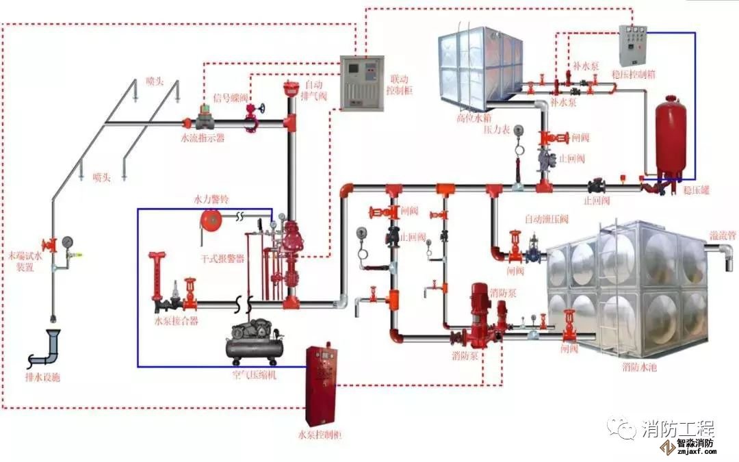 預(yù)作用系統(tǒng)在準(zhǔn)工作狀態(tài)時配水管道內(nèi)不充水,由火災(zāi)自動報警器自動開啟預(yù)作用閥后,轉(zhuǎn)換為濕式系統(tǒng),預(yù)作用系統(tǒng)由閉式噴頭、預(yù)作用閥組、充氣設(shè)備(不是必須有)、水流報警裝置、供水設(shè)施及供水配水管道等組成。