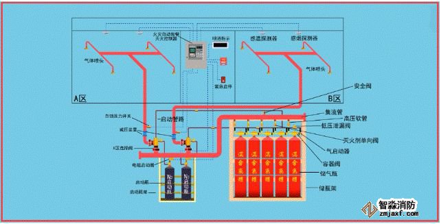該系統(tǒng)由滅火劑儲存裝置、總控閥、驅(qū)動器、噴頭、管道超壓泄放裝置、信號反饋裝置、控制器等組成。