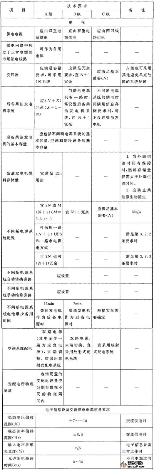 1、數(shù)據(jù)中心用電負(fù)荷等級及供電要求應(yīng)根據(jù)數(shù)據(jù)中心的等級,按下表技術(shù)要求執(zhí)行,并應(yīng)符合現(xiàn)行國家標(biāo)準(zhǔn)《供配電系統(tǒng)設(shè)計(jì)規(guī)范》GB 50052的有關(guān)規(guī)定。