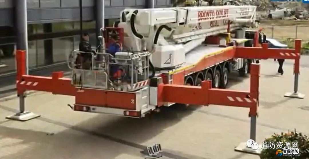 舉高車(chē)工作時(shí),通過(guò)支腿支撐,支腿通過(guò)支承墊板作用在登高場(chǎng)地上,消防車(chē)輪胎并不受力(懸空)。