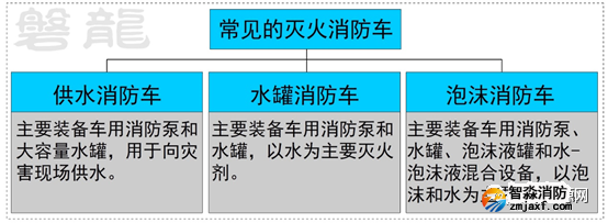 滅火消防車(chē)主要裝備滅火裝置,用于撲滅各類(lèi)火災(zāi),主要分為14類(lèi):水罐消防車(chē)、供水消防車(chē)、泡沫消防車(chē)、干粉消防車(chē)、干粉泡沫聯(lián)用消防車(chē)、干粉水聯(lián)用消防車(chē)、氣體消防車(chē)、壓縮空氣泡沫消防車(chē)、泵浦消防車(chē)、高倍泡沫消防車(chē)、水霧消防車(chē)、高壓射流消防車(chē)、機(jī)場(chǎng)消防車(chē)、渦噴消防車(chē)等。其中,常見(jiàn)的主要有水罐消防車(chē)、供水消防車(chē)、泡沫消防車(chē)等。