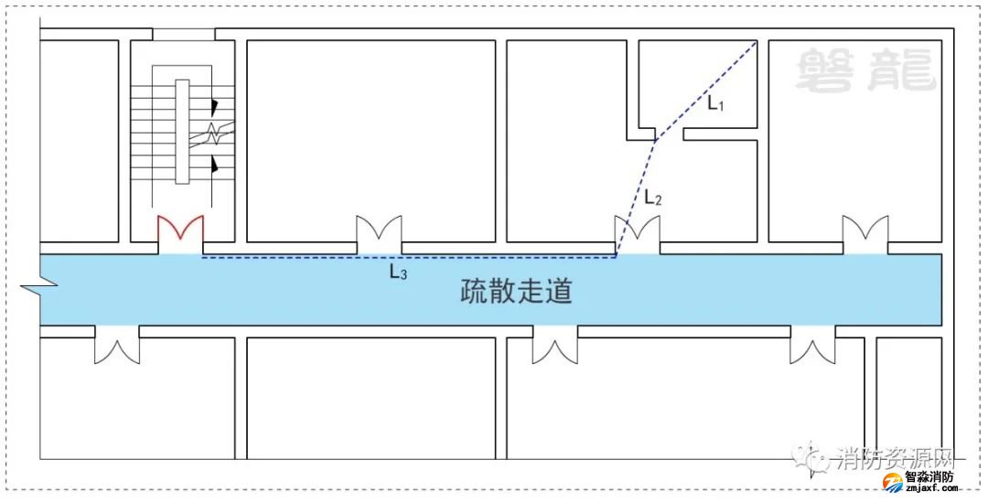 3、確因功能需要,嵌套(穿套)設置的房間不應超過一級,疏散距離應按人員行走的直線距離計算,在圖示4的公共建筑中,示例房間內(nèi)任一點至房間直通疏散走道的疏散門的直線距離,應為L1+L2。