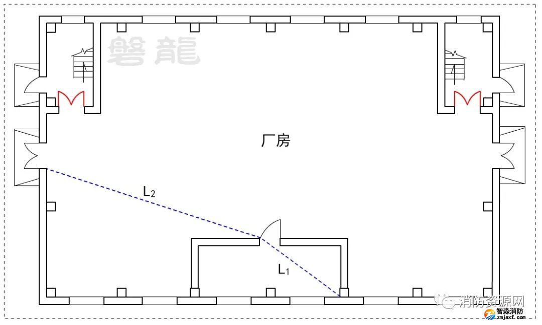 2、廠房倉庫同樣不應采用嵌套(穿套)設置的方式,確因功能需要,嵌套(穿套)設置的房間不應超過一級,疏散距離應按人員行走的直線距離計算,在圖示7的廠房中,示例房間內(nèi)任一點至安全出口的直線距離,應為L1+L2。