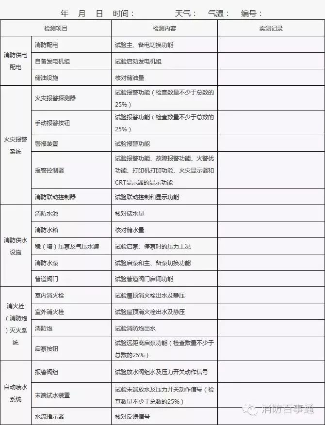 1、建筑消防設(shè)施的單項(xiàng)檢查應(yīng)當(dāng)每月至少一次,并填表。
