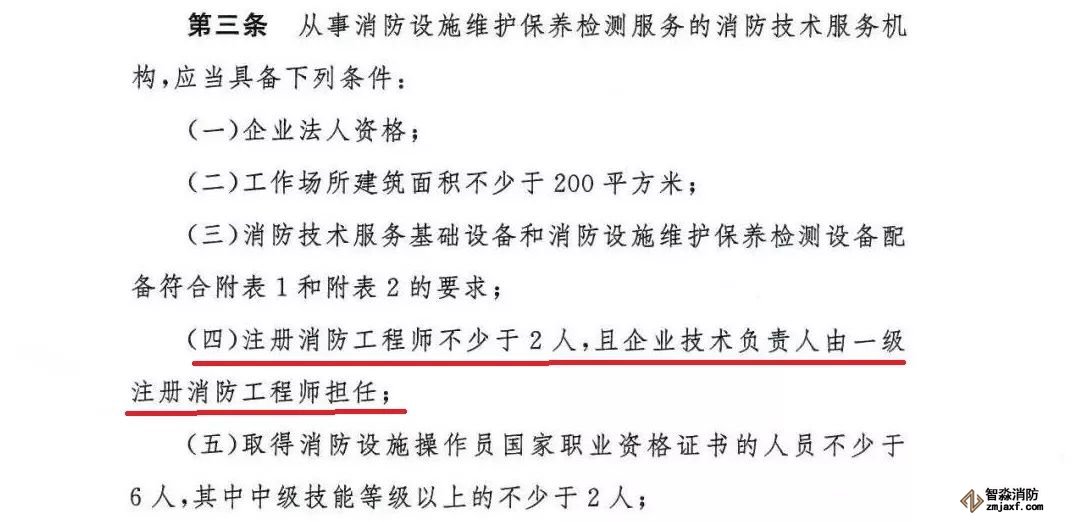 8月29日,應(yīng)急管理部發(fā)布《消防技術(shù)服務(wù)機(jī)構(gòu)從業(yè)條件》的通知,明確要求:從事消防設(shè)施維護(hù)保養(yǎng)檢測服務(wù)的消防技術(shù)服務(wù)機(jī)構(gòu),注冊消防工程師數(shù)量不少于2人,且企業(yè)技術(shù)負(fù)責(zé)人由一級消防工程師擔(dān)任。