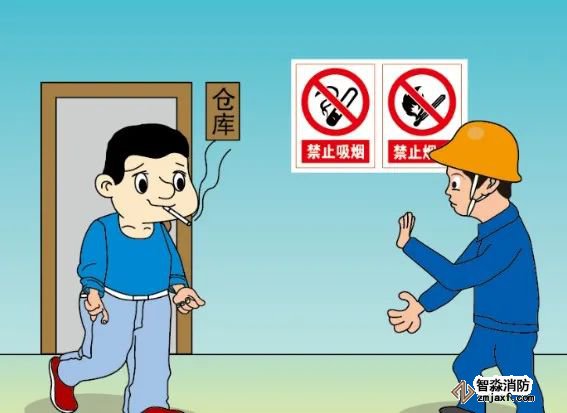 8. 生產(chǎn)車間、原料及成品庫房禁止攜帶火種進入,禁止動用明火、禁止吸煙,設(shè)置醒目的嚴(yán)禁煙火警示牌。