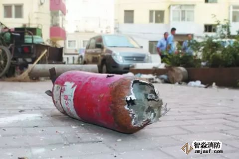 2013年2月,新疆一個(gè)電器商場發(fā)生滅火器爆炸事故,墻角的瓶裝滅火器已經(jīng)變成一張鐵皮。