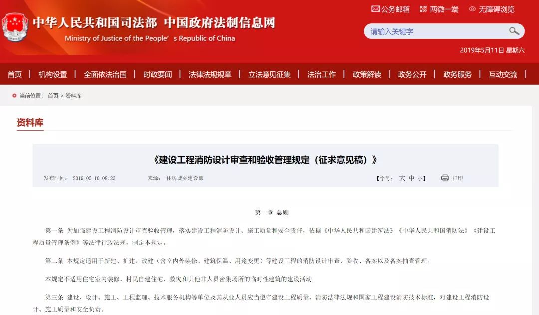 2019年5月10日,中國政府法制信息網(wǎng)發(fā)布:住房和城鄉(xiāng)建設部關于《建設工程消防設計審查和驗收管理規(guī)定(征求意見稿)》公開征求意見的通知。