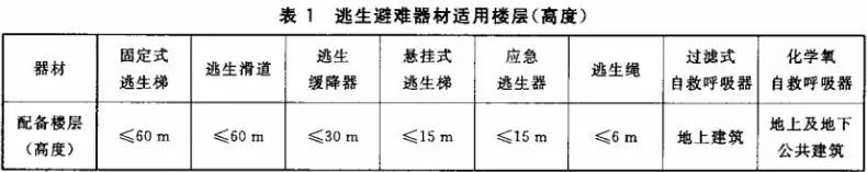 (1)逃生滑道、固定式逃生梯應(yīng)配備在不高于60m的樓層內(nèi);逃生緩降器應(yīng)配備在不高于30m的樓層內(nèi);懸掛式逃生梯、應(yīng)急逃生器應(yīng)配備在不高于15m的樓層內(nèi);逃生繩應(yīng)配備在不高于6m的樓層內(nèi)。地上建筑可配備過(guò)濾式自救呼吸器或化學(xué)氧自救呼吸器,高于30m的樓層內(nèi)應(yīng)配備防護(hù)時(shí)間不少于20min的自救呼吸器。地下建筑應(yīng)配備化學(xué)氧自救呼吸器。逃生避難器材配備樓層(高度)見(jiàn)下表。