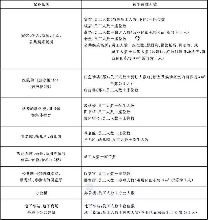 (2)各類(lèi)場(chǎng)所的逃生避難人數(shù)及逃生避難器材可救助人數(shù)的計(jì)算方法參見(jiàn)下表。