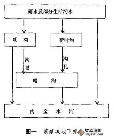 紫禁城排水系統(tǒng)總體規(guī)劃是東西方向的雨水匯入南北干溝,然后流入內(nèi)金水河。各個宮殿院落均設(shè)有干溝、支溝、明溝、暗溝、涵洞、流水溝眼等眾多排水設(shè)施。