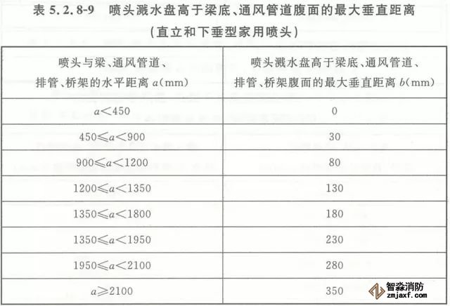 5.2.8 當(dāng)噴頭濺水盤高于附近梁底或高于寬度小于1.2m的通風(fēng)管道、排管、橋架腹面時(shí),噴頭濺水盤高于梁底、通風(fēng)管道、排管、橋架腹面的最大垂直距離應(yīng)符合表5.2.8-1~表5.2.8-9的規(guī)定(見圖5.2.8)。