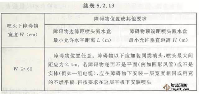 5.2.13 早期抑制快速響應(yīng)(ESFR)噴頭與噴頭下障礙物的距離應(yīng)滿足本規(guī)范圖5.2.12所示的要求。當(dāng)無法滿足要求時(shí),噴頭下障礙物的寬度與位置應(yīng)滿足本規(guī)范表5.2.13的規(guī)定。