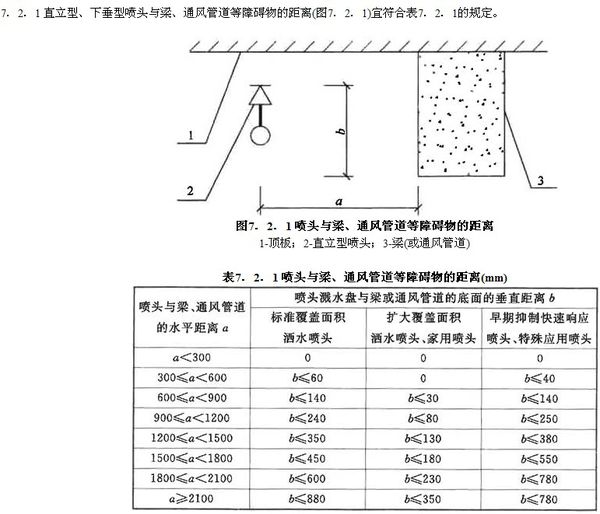 直立型灑水噴頭濺水盤與頂板的距離應(yīng)為75mm~150mm,并應(yīng)符合下列規(guī)定:1 當(dāng)在梁或其他障礙物底面下方的平面上布置灑水噴頭時(shí),濺水盤與頂板的距離不應(yīng)大于300mm,同時(shí)濺水盤與梁等障礙物底面的垂直距離應(yīng)為25mm~100mm。2 當(dāng)在梁間布置灑水噴頭時(shí),灑水噴頭與梁的距離應(yīng)符合本規(guī)范第7.2.1條的規(guī)定。確有困難時(shí),濺水盤與頂板的距離不應(yīng)大于550mm。梁間布置的灑水噴頭,濺水盤與頂板距離達(dá)到550mm仍不能符合本規(guī)范第7.2.1條的規(guī)定時(shí),應(yīng)在梁底面的下方增設(shè)灑水噴頭。3 密肋梁板下方的灑水噴頭,濺水盤與密肋梁板底面的垂直距離應(yīng)為25mm~100mm。