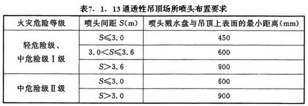 裝設(shè)網(wǎng)格、柵板類通透性吊頂?shù)膱?chǎng)所,當(dāng)通透面積占吊頂總面積的比例大于70%時(shí),噴頭應(yīng)設(shè)置在吊頂上方,并應(yīng)符合下列規(guī)定:1 通透性吊頂開口部位的凈寬度不應(yīng)小于10mm,且開口部位的厚度不應(yīng)大于開口的最小寬度;2 噴頭間距及濺水盤與吊頂上表面的距離應(yīng)符合表7.1.13的規(guī)定。