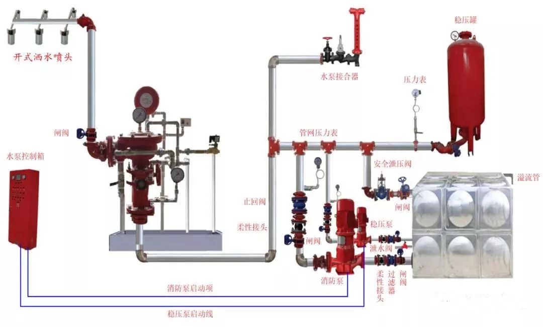 7、 雨淋系統(tǒng)由雨淋閥控制噴水范圍,由配套的火災自動報警系統(tǒng)或傳動管系統(tǒng)啟動雨淋閥,由開式噴頭、雨淋閥組、水流報警裝置、供水設施及供水配水管道等組成。
