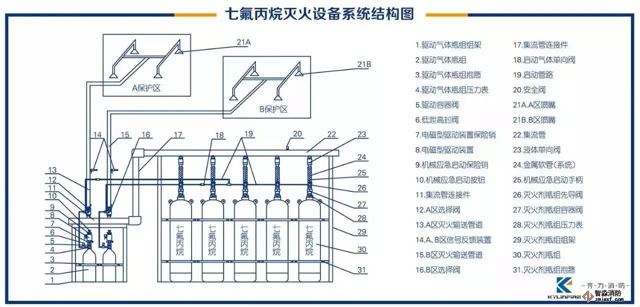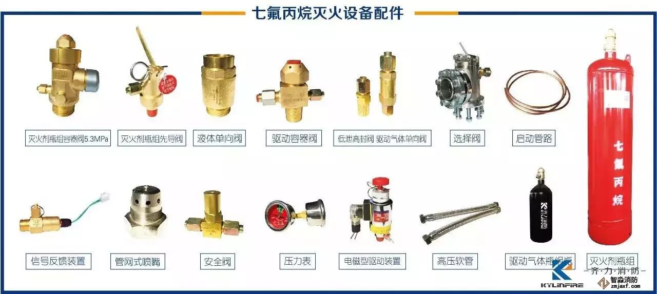 七氟丙烷滅火設(shè)備需要設(shè)置專(zhuān)用的設(shè)備間,用一套或一套以上的貯存裝置保護(hù)一個(gè)或一個(gè)以上的保護(hù)區(qū)(總保護(hù)區(qū)數(shù)量≤8個(gè),總保護(hù)區(qū)體積≤3600m³),使用管網(wǎng)將滅火劑輸送到保護(hù)區(qū)的系統(tǒng)。