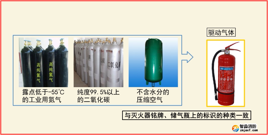 (6)儲壓式干粉滅火器和潔凈氣體滅火器可選用露點低于-55℃的工業(yè)用氮氣、純度99.5%以上的二氧化碳、不含水分的壓縮空氣等作為驅動氣體,但要與滅火器銘牌、儲氣瓶上標識的種類一致。