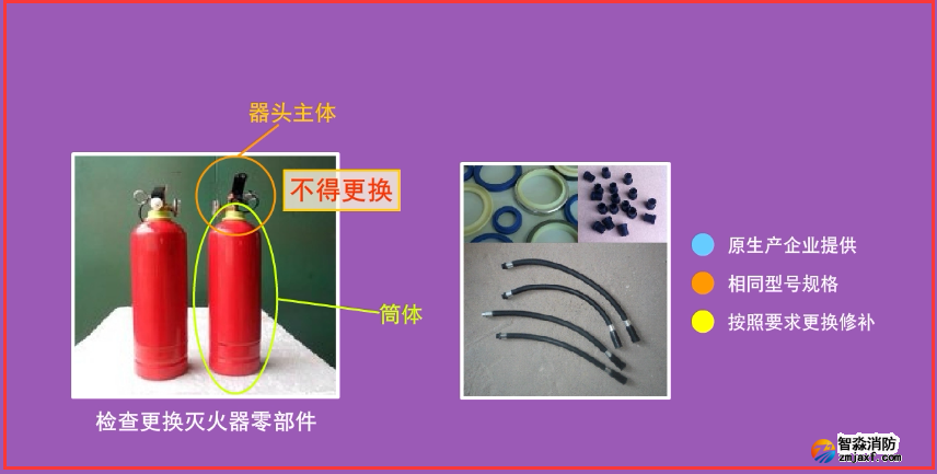 對滅火器零部件檢查后,更換密封件和損壞的零部件,但不得更換滅火器筒體和器頭主體。所有需要更換的零部件應采用原生產企業(yè)提供、推薦的相同型號規(guī)格的產品,并按照下列要求更換、修補零部件: