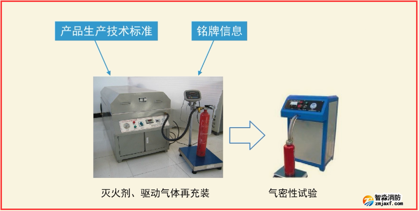 根據(jù)滅火器產品生產技術標準和銘牌信息,按照生產企業(yè)規(guī)定的操作要求,實施滅火劑、驅動氣體再充裝。再充裝后,逐具進行氣密性試驗;