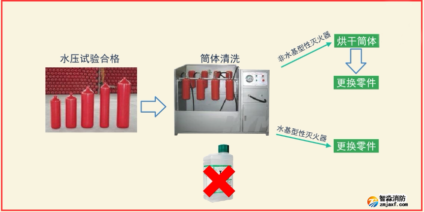 經水壓試驗合格的滅火器筒體,首先將其內部清洗干凈。清洗時,不得使用有機溶劑洗滌滅火器的零部件。然后對所有非水基型滅火器筒體進行內部干燥,以確??諟缁鹌鲀炔繚崈舾稍?。