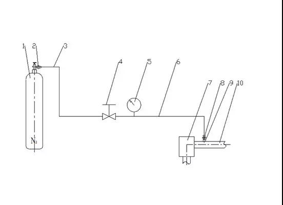 (2)試驗前應(yīng)先進行預(yù)試驗,先將針型閥打開,再緩慢打開氮氣瓶,同時觀察壓力表5的變化情況,當(dāng)壓力值上升到0.2MPa時,關(guān)閉氮氣瓶和針型閥,檢查每個焊接處與螺紋接口處是否有泄漏,如有泄漏,應(yīng)修復(fù)后方可繼續(xù)向管道內(nèi)充氣試壓。