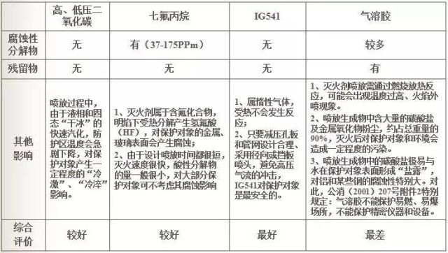 高、低壓二氧化碳、IG541、七氟丙烷、氣溶膠等氣體滅火系統(tǒng)基本上都具有不導電、腐蝕性小、無浸漬、滅火后不留痕跡的特點,總體來說對大多數(shù)保護對象,包括電器設備、儀器儀表、圖書檔案等都是安全的。