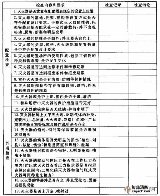 根據(jù)GB50444要求,滅火器的配置、外觀等至少每月檢查一次;對(duì)于候車(chē)(機(jī)、船)室、歌舞娛樂(lè)放映游藝等人員密集的公共場(chǎng)所,以及堆場(chǎng)、罐區(qū)、石油化工裝置區(qū)、加油站、鍋爐房、地下室等場(chǎng)所,至少每半月檢查一次,基本檢查內(nèi)容及要求如下: