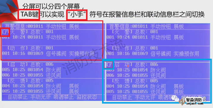顯示屏分上、下半屏,上半屏為火警、監(jiān)管、故障、屏蔽等屬于報(bào)警信息,下半屏為啟動(dòng)、反饋、動(dòng)作等屬于聯(lián)動(dòng)信息