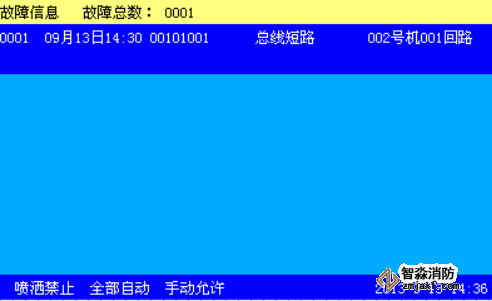消防報(bào)警系統(tǒng)某個(gè)回路總線發(fā)生短路、線間電流過(guò)大時(shí),控制器發(fā)出聲、光報(bào)警,同時(shí)在液晶屏上以中文顯示總線短路(見(jiàn)下圖),打印機(jī)、歷史記錄記錄相應(yīng)的故障信息。