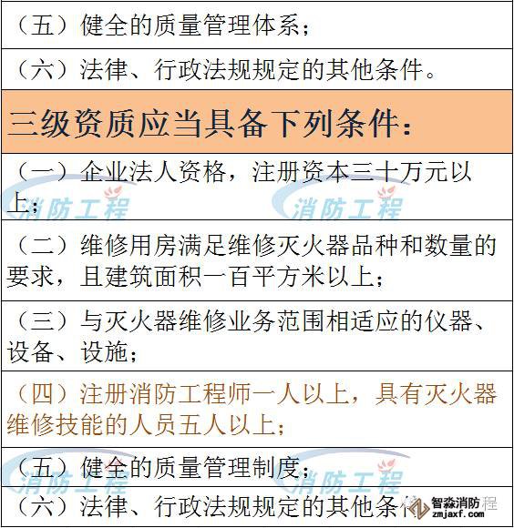 三級(jí)資質(zhì)、臨時(shí)三級(jí)資質(zhì)的消防設(shè)施維護(hù)保養(yǎng)機(jī)構(gòu)可以從事生產(chǎn)企業(yè)授權(quán)的滅火器檢查、維修、更換滅火器藥劑及回收等活動(dòng)。