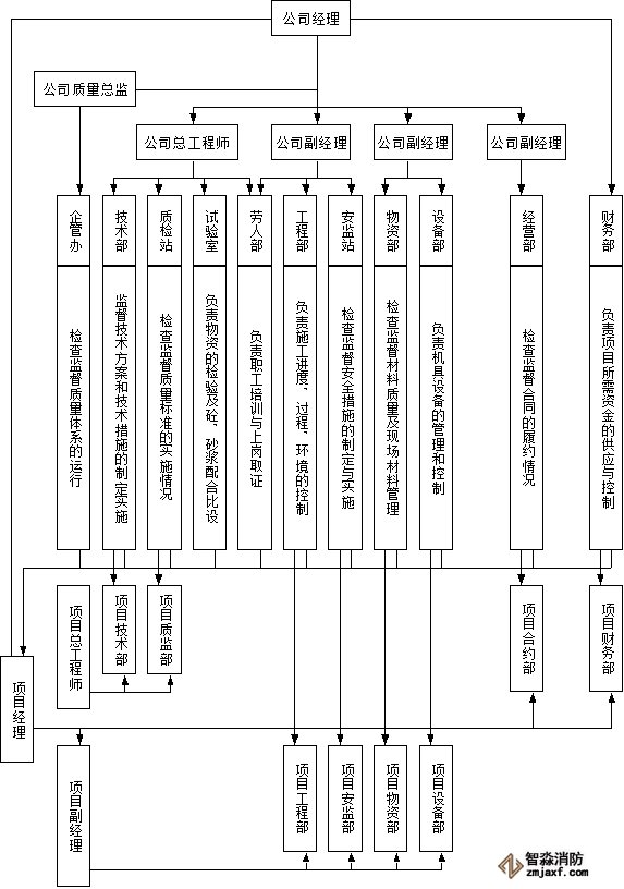 2.1按貫標認證的要求組成項目經(jīng)理部,健全完善的質(zhì)量體系,根據(jù)ISO9001:2000國際標準要求,組建工程項目經(jīng)理部,項目經(jīng)理部設(shè)項目經(jīng)理、技術(shù)負責(zé)人及四部一室(材料設(shè)備部、技術(shù)質(zhì)安部、生產(chǎn)經(jīng)營部、財務(wù)勞資部、綜合辦公室),項目經(jīng)理代表我方對項目全面負責(zé),是工程質(zhì)量的第一負責(zé)人,在項目上實施制定的質(zhì)量方針和“質(zhì)量、工期、服務(wù)”的企業(yè)宗旨,全面履行工程合同。技術(shù)負責(zé)人對項目經(jīng)理負責(zé),協(xié)助項目經(jīng)理監(jiān)督管理項目質(zhì)量體系的運行,