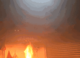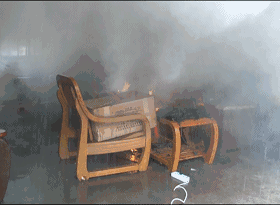 (實(shí)驗(yàn)畫面顯示,火災(zāi)發(fā)生后,獨(dú)立感煙探測(cè)器開始報(bào)警,簡(jiǎn)易噴淋開始噴水)