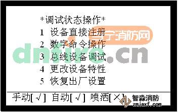 按下“系統(tǒng)設(shè)置”按鍵,在系統(tǒng)設(shè)置操作狀態(tài)下,鍵入“6”,便進(jìn)入調(diào)試操作狀態(tài),如圖2所示。調(diào)試狀態(tài)提供了設(shè)備直接注冊、數(shù)字命令操作、總線設(shè)備調(diào)試、更改設(shè)備特性、恢復(fù)出廠設(shè)置五種操作。