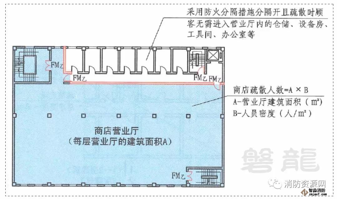 注1:本條所指“營業(yè)廳的建筑面積”,既包括營業(yè)廳內展示貨架、柜臺、走道等顧客參與購物的場所,也包括營業(yè)廳內的衛(wèi)生間、樓梯間、自動扶梯等的建筑面積。對于進行了嚴格的防火分隔,并且疏散時無需進入營業(yè)廳內的倉儲、設備房、工具間、辦公室等,可不計入營業(yè)廳的建筑面積。