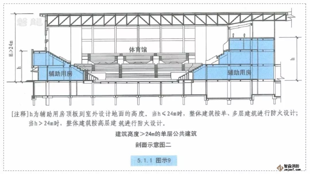 二、建筑高度大于24m的單層體育館,由于具有相對(duì)方便的疏散和撲救條件,仍不劃分為高層建筑。
