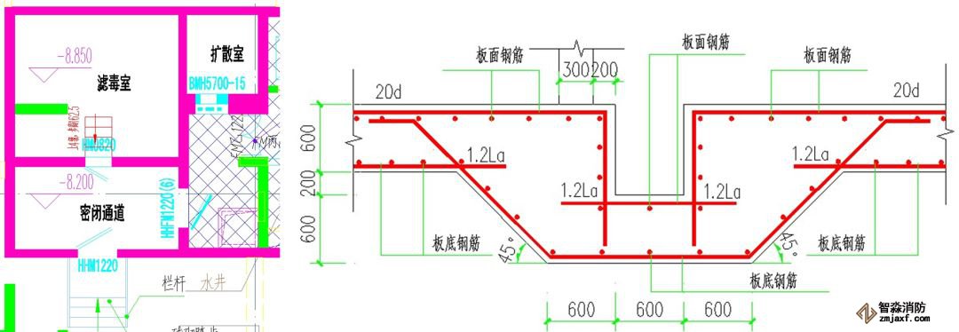 1)人防區(qū)內(nèi)梁板配筋圖紙一般由人防院設(shè)計,但模板關(guān)系(如洞口定位,梁定位、標(biāo)高)由民用院模板圖表達(dá),所以梁板配筋應(yīng)結(jié)合兩院圖紙施工。