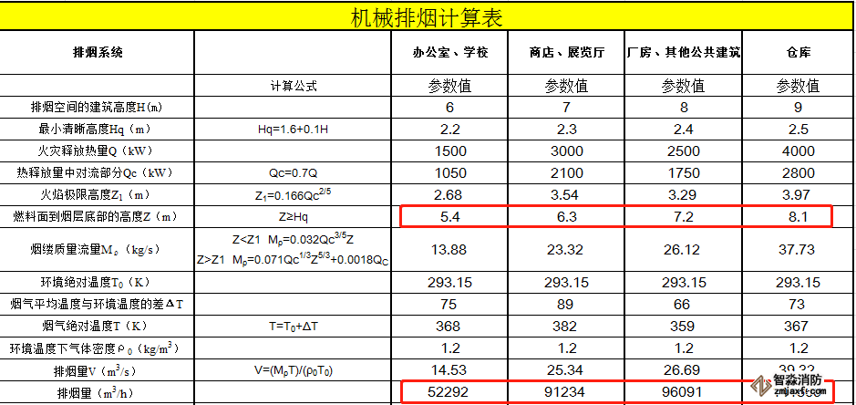 通過反算可知,表4.6.3中的排煙量數(shù)據(jù),應(yīng)該是按儲煙倉高度為10%房間凈高時(shí)的結(jié)果(以下為有噴淋情況的反算推算表),儲煙倉高度為房間凈高的10%,是規(guī)范要求的機(jī)械排煙最小儲煙倉厚度,也是燃料面到煙層底部高度(Z)的最大高度,由下表公式可知,相同條件下,煙層底部高度(Z)最大值時(shí)對應(yīng)的排煙量即最大排煙量,也就是說,表4.6.3所列的排煙量為最大排煙量,任何其他計(jì)算條件下的排煙量都不可能大于這個排煙量,再規(guī)定計(jì)算值不應(yīng)小于表4.6.3中的數(shù)值無意義