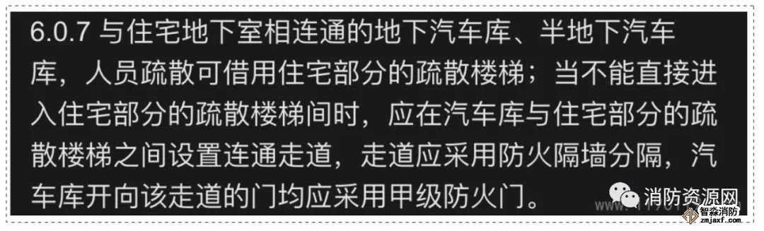 3、與住宅地下室相連通的地下汽車庫(或半地下汽車庫),汽車的人員疏散,可借用住宅部分的疏散樓梯,詳見《 汽車庫、修車庫、停車場設(shè)計防火規(guī)范》6.0.7