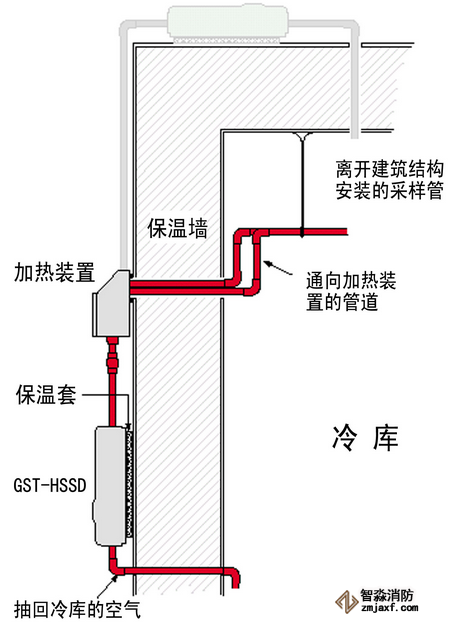 冷庫中采樣管,加熱箱和吸氣式感煙火災(zāi)探測器的相對位置