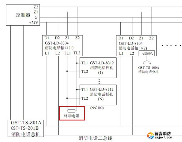 海灣GST-LD-8312消防電話插孔端子XT1電話線輸入端,端子XT2電話線輸出端,接下一個電話插孔,最末端電話插孔XT2接線端子接4.7kΩ終端電阻。