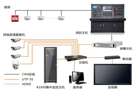本聯(lián)動(dòng)系統(tǒng)主要由火災(zāi)自動(dòng)報(bào)警系統(tǒng)、報(bào)警主機(jī)服務(wù)器、視頻監(jiān)控系統(tǒng)組成。
