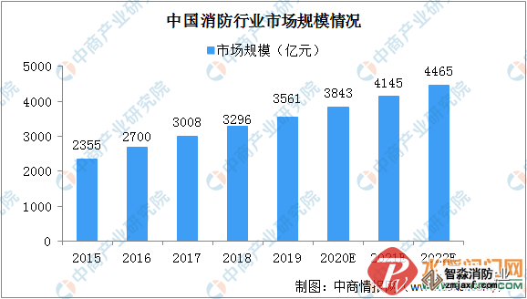 消防安全意識逐步提高,消防逐漸成為主動需求。城鎮(zhèn)化水平和交通運輸?shù)扰涮淄顿Y不斷提高,持續(xù)帶動消防需求隨著我國城鎮(zhèn)化水平的不斷提升,消防行業(yè)的發(fā)展也迎來重要契機(jī)。近幾年,消防行業(yè)規(guī)模迅速擴(kuò)大。2015年消防行業(yè)市場規(guī)模2355億元,2019年市場規(guī)模突破3500億元,預(yù)計2022年市場規(guī)模將達(dá)到4465億元。