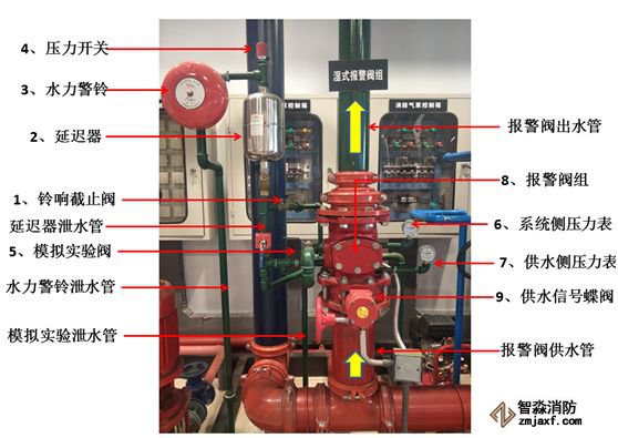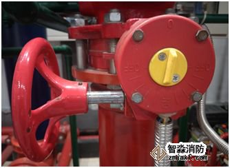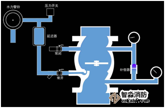而發(fā)出聲光警報(bào)顯示火災(zāi)區(qū)域。同時(shí)由于濕式報(bào)警閥的開(kāi)啟,使一部分水流入報(bào)警管路,通過(guò)延時(shí)器延時(shí)后水力警鈴發(fā)出報(bào)警鈴聲,同時(shí)壓力開(kāi)關(guān)動(dòng)作向火災(zāi)報(bào)警控制器發(fā)出反饋信號(hào),火災(zāi)報(bào)警控制器通過(guò)邏輯關(guān)系啟動(dòng)噴淋泵。