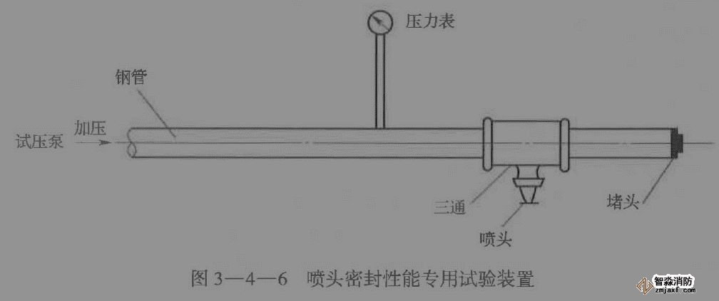 3)試驗(yàn)以噴頭無(wú)滲漏、無(wú)損傷判定為合格。累計(jì)兩只以及兩只以上噴頭試驗(yàn)不合格的,不得使用該批噴頭。(試壓泵、壓力表、秒表)