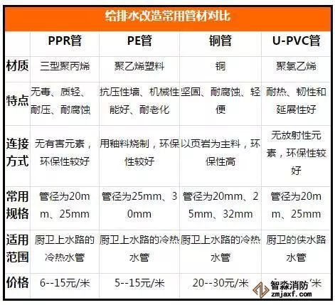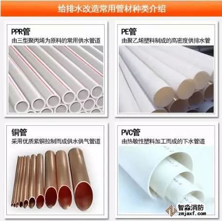 給排水改造的管材包括:PPR管、PE管、銅管、U-PVC管、鍍塑管、不銹鋼管、鍍鋅管等。一般,上水改造通常會使用環(huán)保的PPR管,鍍鋅管和銅管也屬主流管材。而下水改造的材料一般選用有阻燃效果的U-PVC管。
