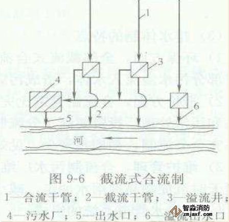 臨河岸邊建造一條截流干渠,同時(shí)在合流干管與截流干管相交前或相交處設(shè)置溢流井,并在截留干管下游設(shè)置污水廠。晴天和初降雨時(shí)所有污水都排送至污水廠,經(jīng)處理后排入水體,隨著降雨量的增加,雨水徑流也增加,就有部分混合污水經(jīng)溢流井溢出,直接排入水體。